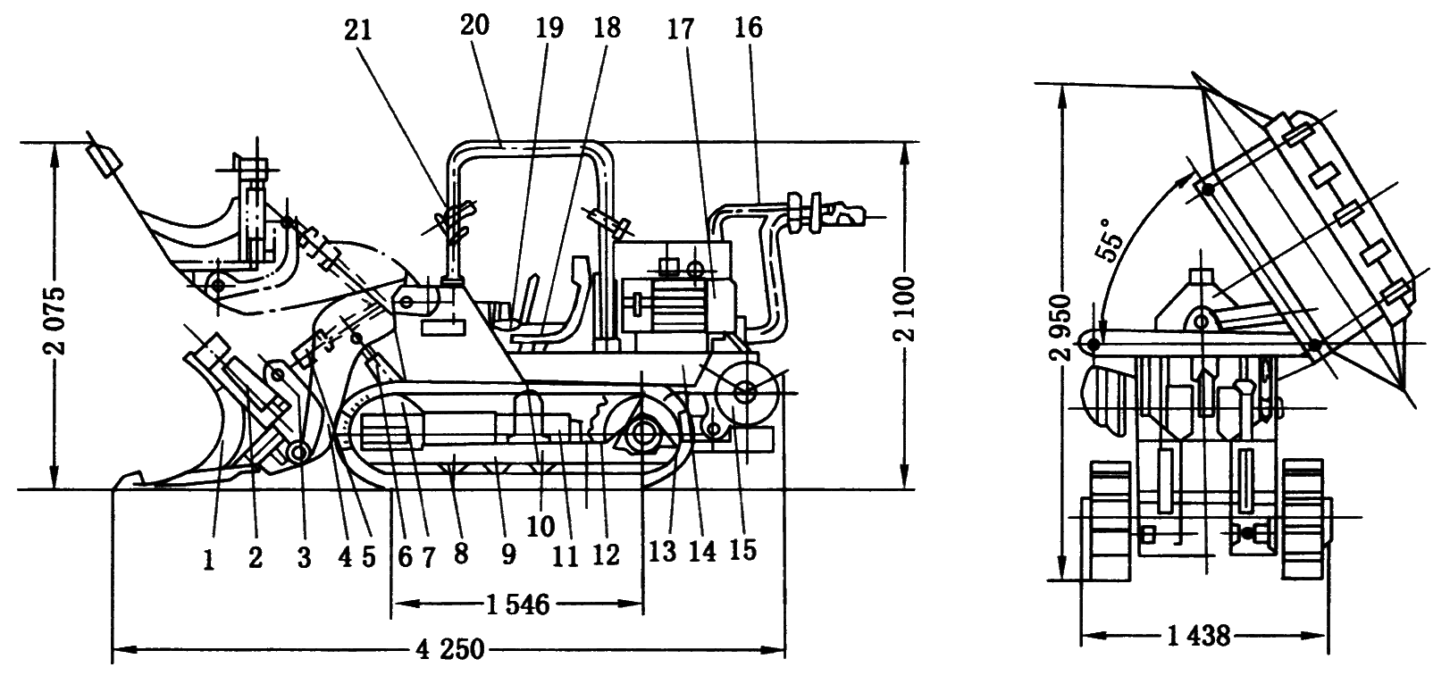 1—铲斗;2—侧卸油缸;3—铲斗座;4—摇臂;5—连杆;6—举升油缸;7—导轮;8—履带架;9—支重轮;10—托轮;11—张紧装置;12—驱动轮;13—履带;14—机器机架;15—行走部电动机;16—电缆;17—泵端电动机;18—司机座;19—操纵台;20—司机棚;21—照明灯