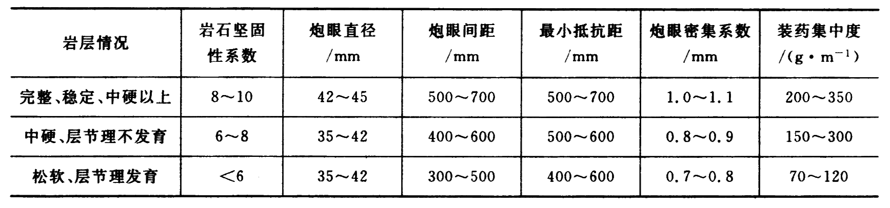 上表中的数据在岩巷是按 2 号岩石硝铵炸药、毫秒延期雷管指定的。若采用其他炸药时,则需根据炸药爆力大小,按下式修正: