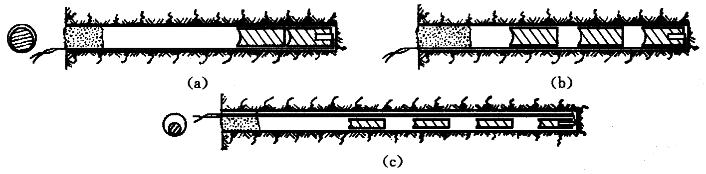 (a) 单段空气柱耦合装药;(b) 空气柱间隔装药;(c) 小直径药卷不耦合间隔装药