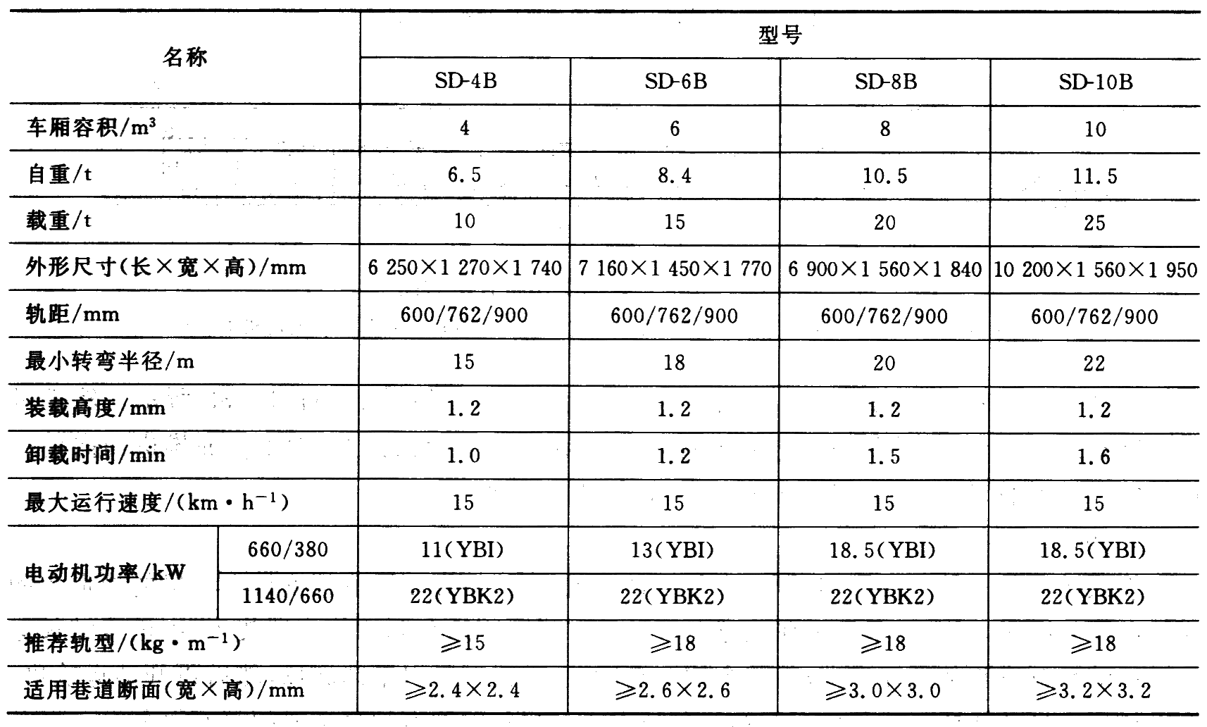 根据工作面的条件,梭车可单车使用,也能若干辆搭接组成梭式列车运行。这是可一次性将爆破方量全装完,以减少调车和出砟时间,加快掘进速度,特别适用于斜井或平硐施工。国内生产的梭车定型产品分小型、和大型,容积有4、6、8、10、12、14、16、20、25、30、45m3 共 11 种,其中小型梭车型号及技术特征见下页表。