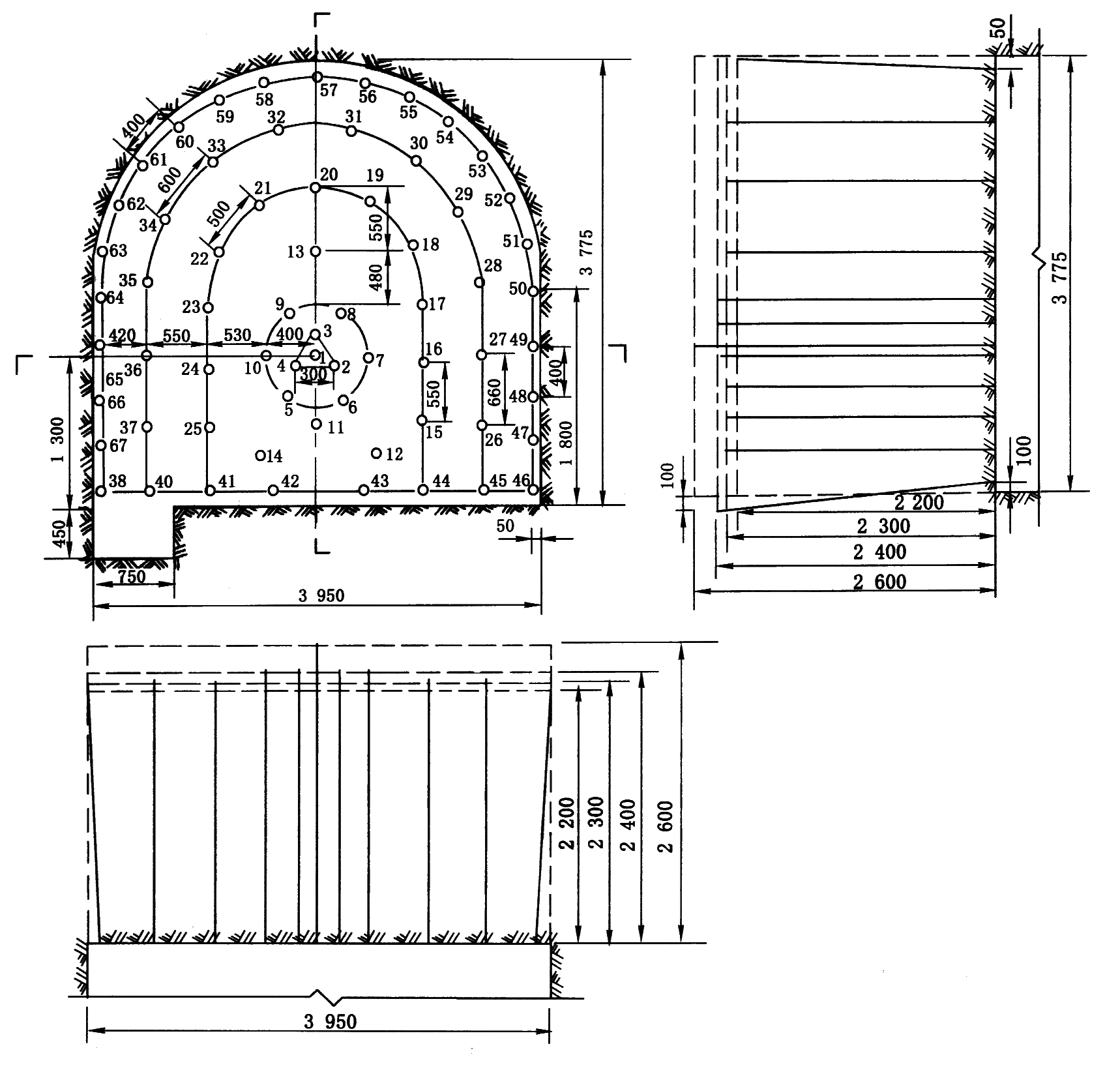21~33—第三圈辅助眼;34~37,55~59—帮眼;38~54—采拱眼;60~67—底眼;68—水沟眼