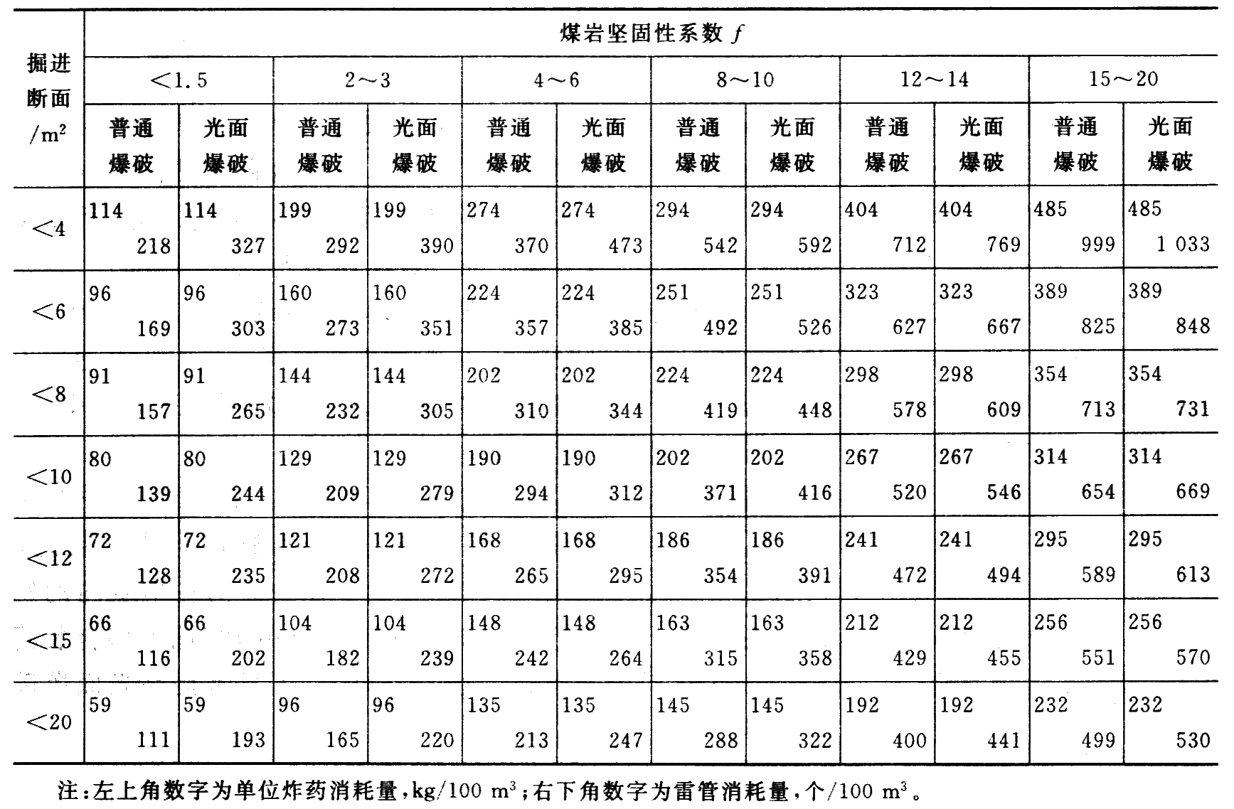 炸药消耗量是一个重要参数,它直接影响到岩石块度、钻眼和装岩的工作量、炮眼利用率、巷道轮廓、围岩稳定性以及爆破成本等。目前还没有精确计算炸药消耗量的方法,计算数一般仅作为参考,所以多按定额选用,见下页表。