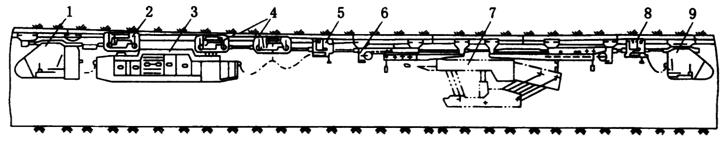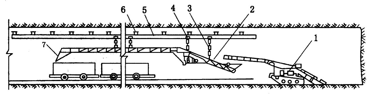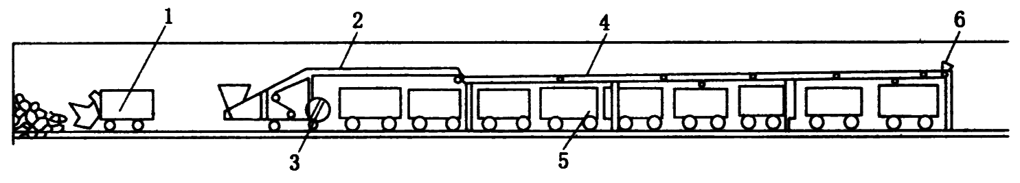 1—装载机;2—悬臂式转载机;3—电动机;4—支撑式转载机;5—矿车;6—输送机电动机