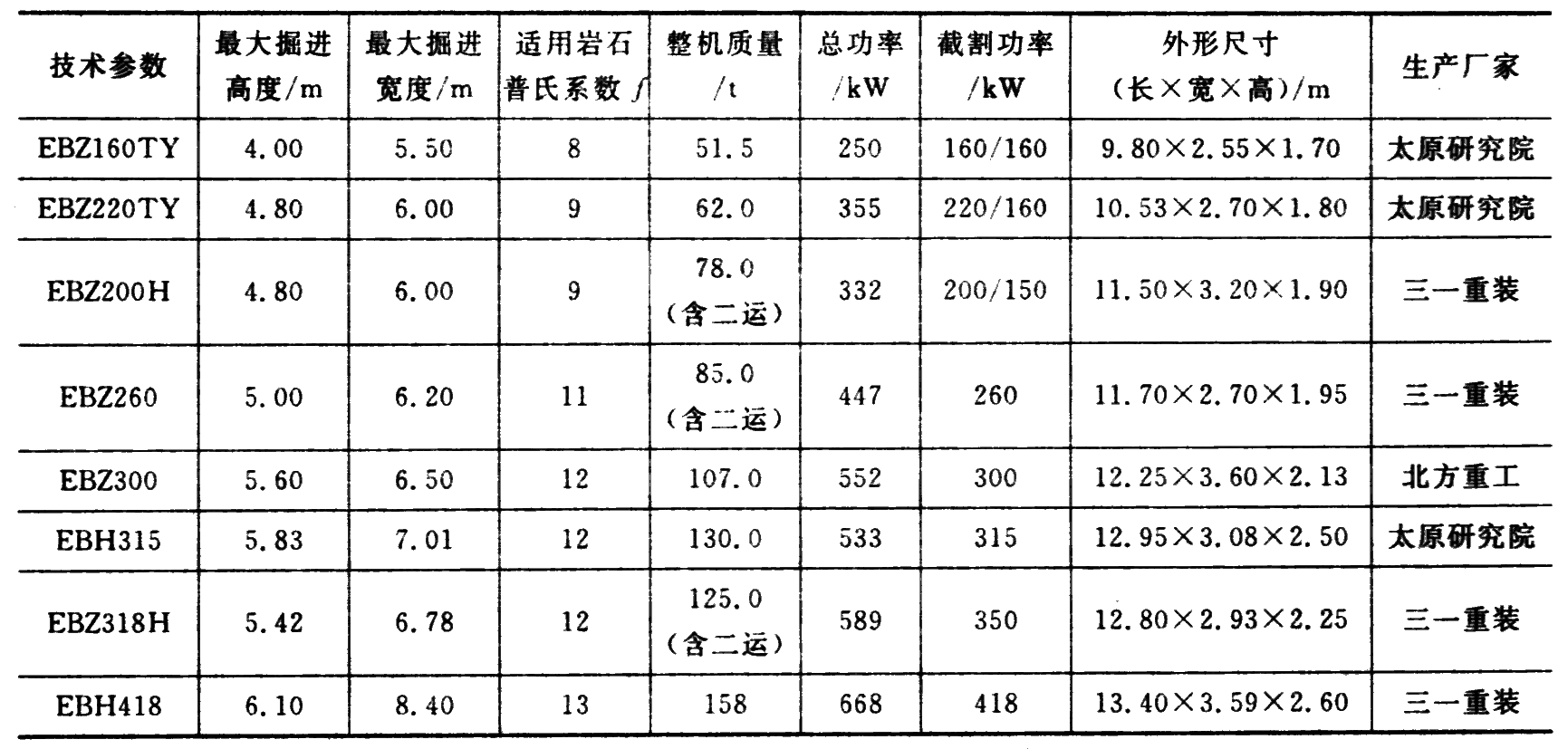 我国经过50年的消化吸收和创新,悬臂式掘进机从轻型、中型发展到重型,已经形成了 EBJ、EBZ、EBH 三大系列。以全国的应用情况来看,对坚固性系数 f < 8 的岩石巷道效果较好,f > 8的硬岩效果差,且粉尘污染问题较难解决。