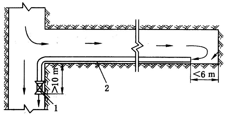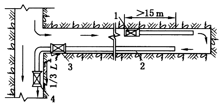 1—压入式局部通风机;2—风筒;3,4—抽出式局部通风机