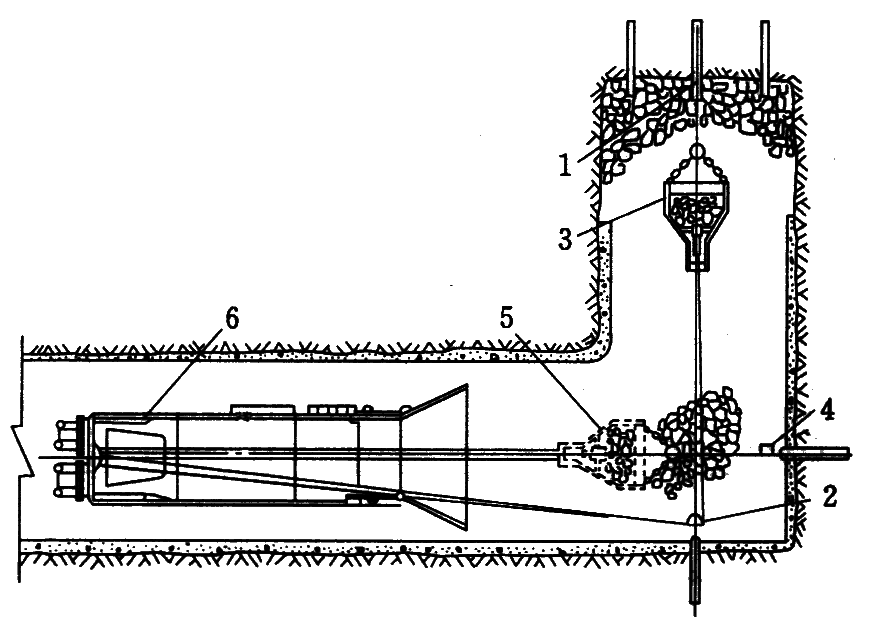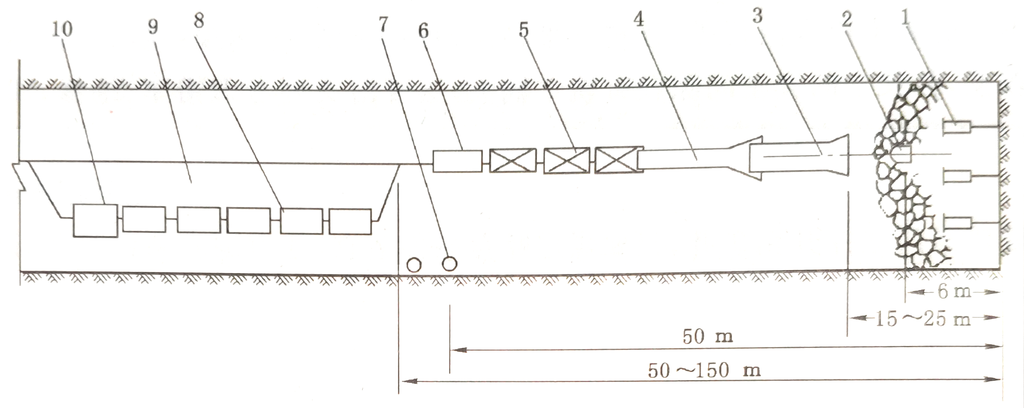 1—气腿式凿岩机;2—耙斗;3—装载机;4—转载机;5—重车;