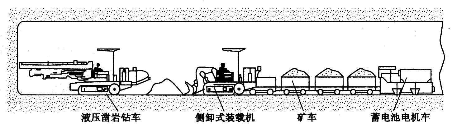1—侧卸式装载机;2—转载机;3—凿岩台车;4—矿车组;5—电机车