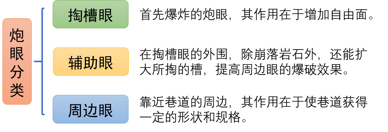辅助眼又称崩落眼,是大量崩落岩石和继续扩大掏槽的炮眼。
