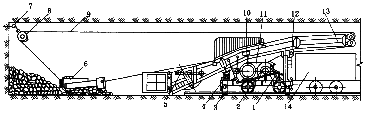 1—蟹爪式装载机;2—悬臂式胶带转载机;3—矿车