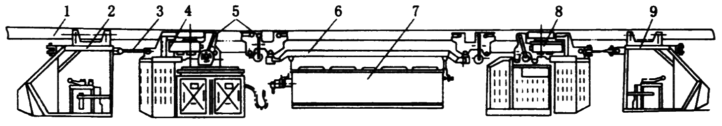 1—轨道;2,9—司机室;3—连接拉杆;