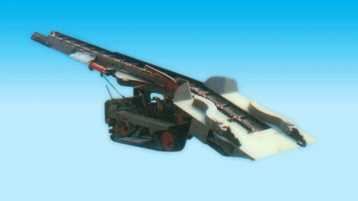 这种装载机前端的铲板上设有一对蟹爪,在电机或液压马达驱动下,连续交替耙取矸石,矸石经刮板输送机运到机尾的胶带输送机上,而后装入运输设备。
