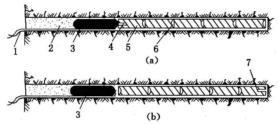 1—雷管脚线;2—黏土炮泥;3—水泡泥;4—雷管;5—炸药卷;6—药卷聚能穴;7—雷管聚能穴