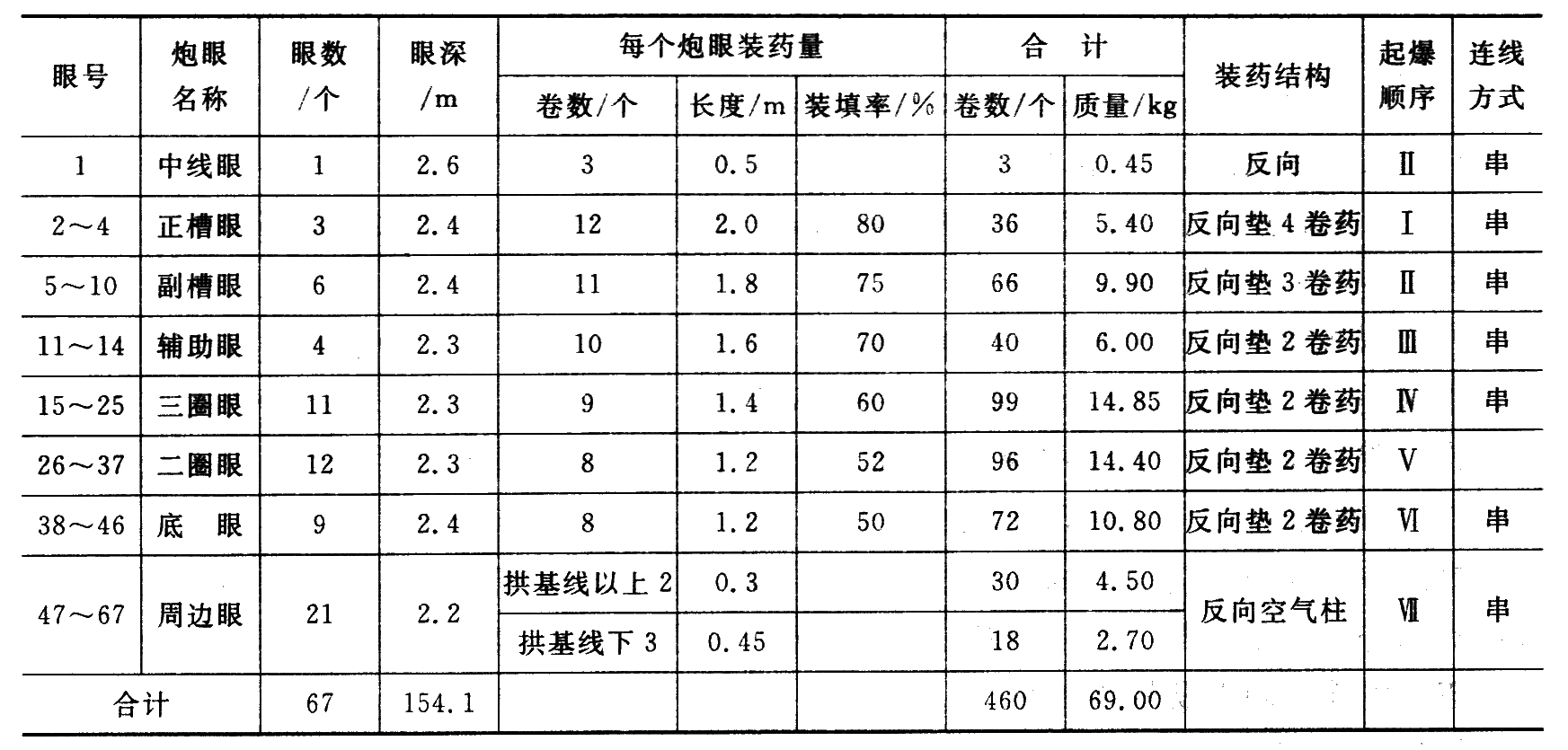 确定单位炸药消耗量后,根据巷道断面和炮眼深度可计算出每循环所用的炸药消耗总量 Q。然后按炮眼数目、各炮眼所起的作用和所分担的爆破岩体加以分配,最后确定出掏槽眼、辅助眼和周边眼的各眼装药量。