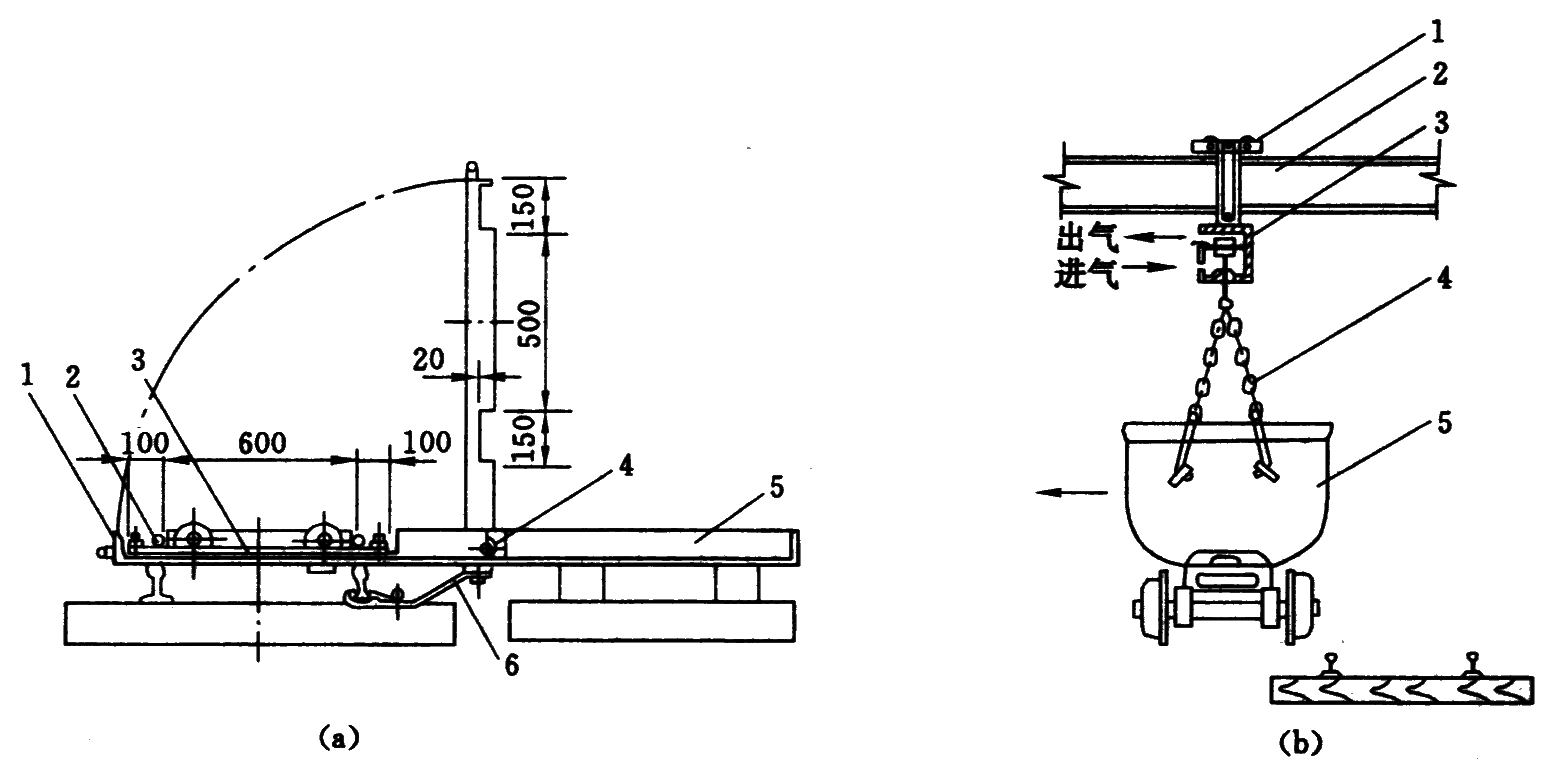 (b) 风动调车器:1—小车;2—钢梁;3—汽缸;4—悬吊链;5—矿车