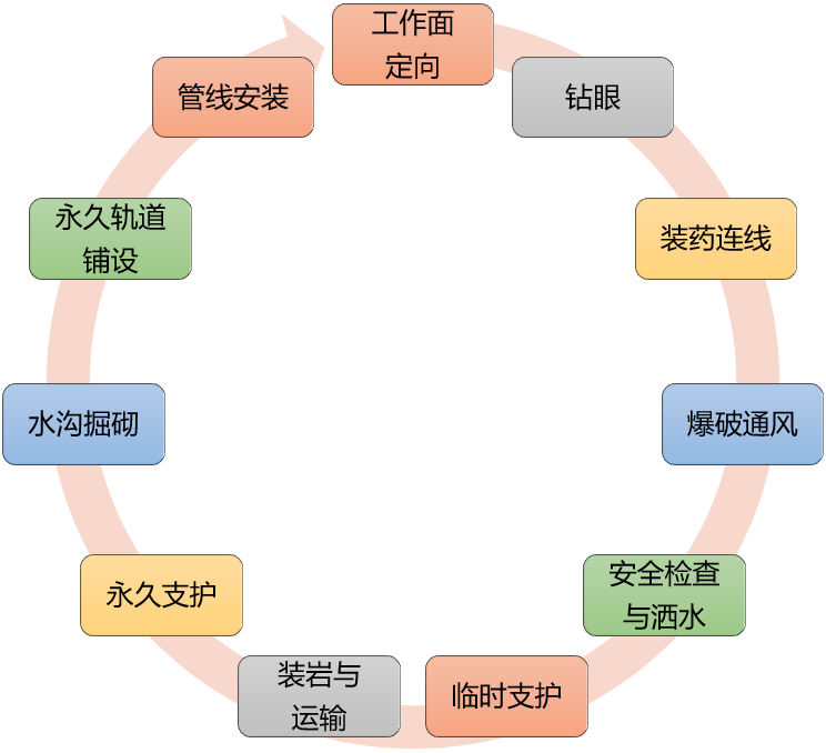 优点:可多台钻机同时工作,使用灵活且不受断面大小影响,钻眼、装岩两大工序大部分时间都能平行作业。