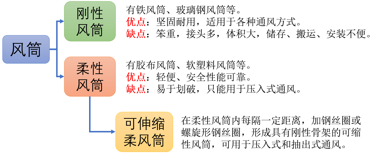 优点:可采用胶质或塑料等柔性风筒;有效射程大,冲淡和排出炮烟的作用比较强;工作面回风不通过风机,在有瓦斯涌出的工作面采用这种通风方式比较安全;工作面回风沿井巷流出,沿途能一并把粉尘等有害气体带走。