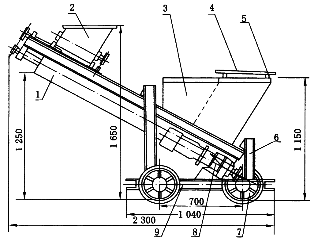 5—风动振动器;6—支撑架;7—轮轴;8—减速器;9—车架