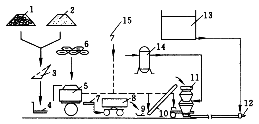 1—石子;2—砂子;3—筛子;4—磅秤;5—运料小车;6—水泥;7—筛子;8—搅拌机;