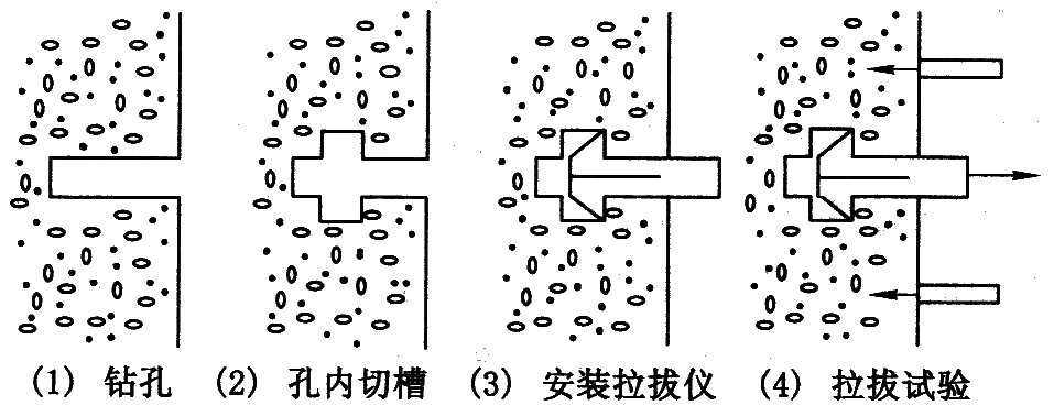 (a) 钻孔;(b) 切槽;(c) 安装扩拔器;(d) 拉拔扩拔器