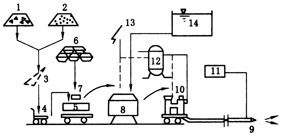 9—喷嘴;10—湿喷机;11—液体速凝剂;12—气包;13—电源;14—水箱