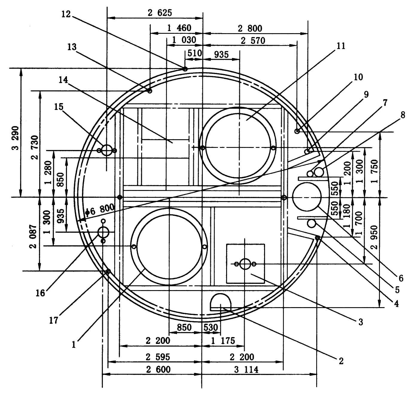 1—吊桶(3m³);2—安全梯;3—吊泵;4,12,17—模板悬吊绳;5—排水管;