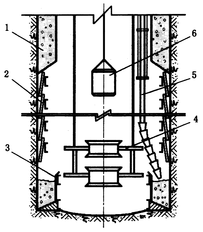 1—井壁;2—井圈背板;3—模板;4—吊盘;5—混凝土输送管;6—吊桶