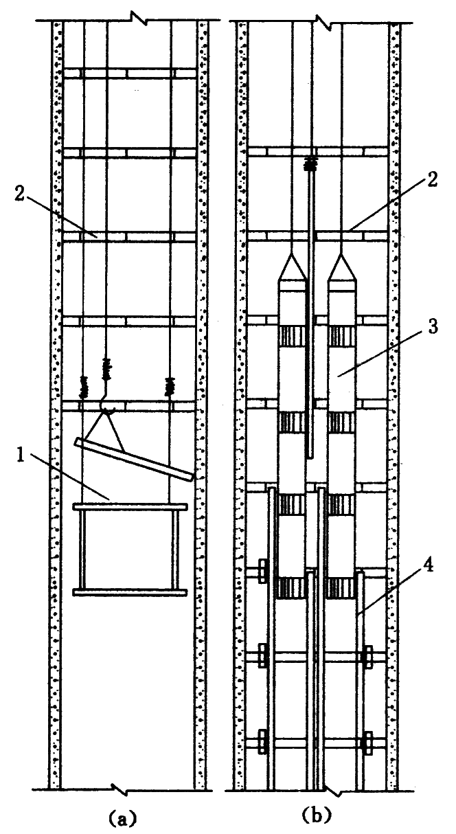 1—箕斗;2—罐笼;3—钢丝绳罐道;4—防撞钢丝绳