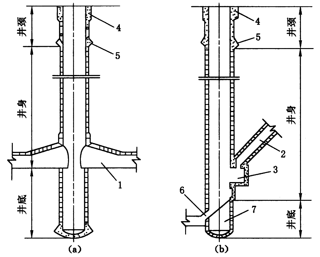 1—副井马头门;2—煤仓;3—箕斗装载硐室;4—井壁;5—壁座;6—主井接受仓;7—水窝