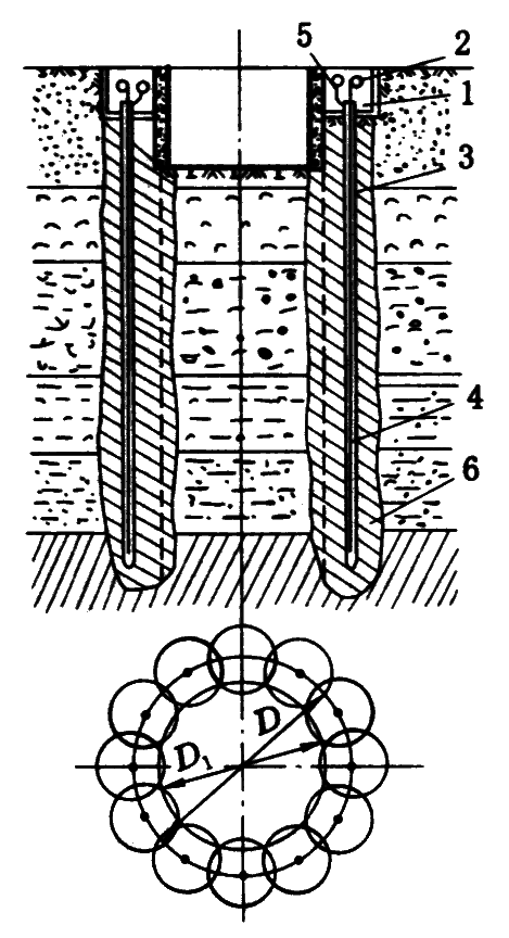 1—冰冻沟槽;2—配液管;3—冻结管;4—供液管;5—回液管;6—冻结圈