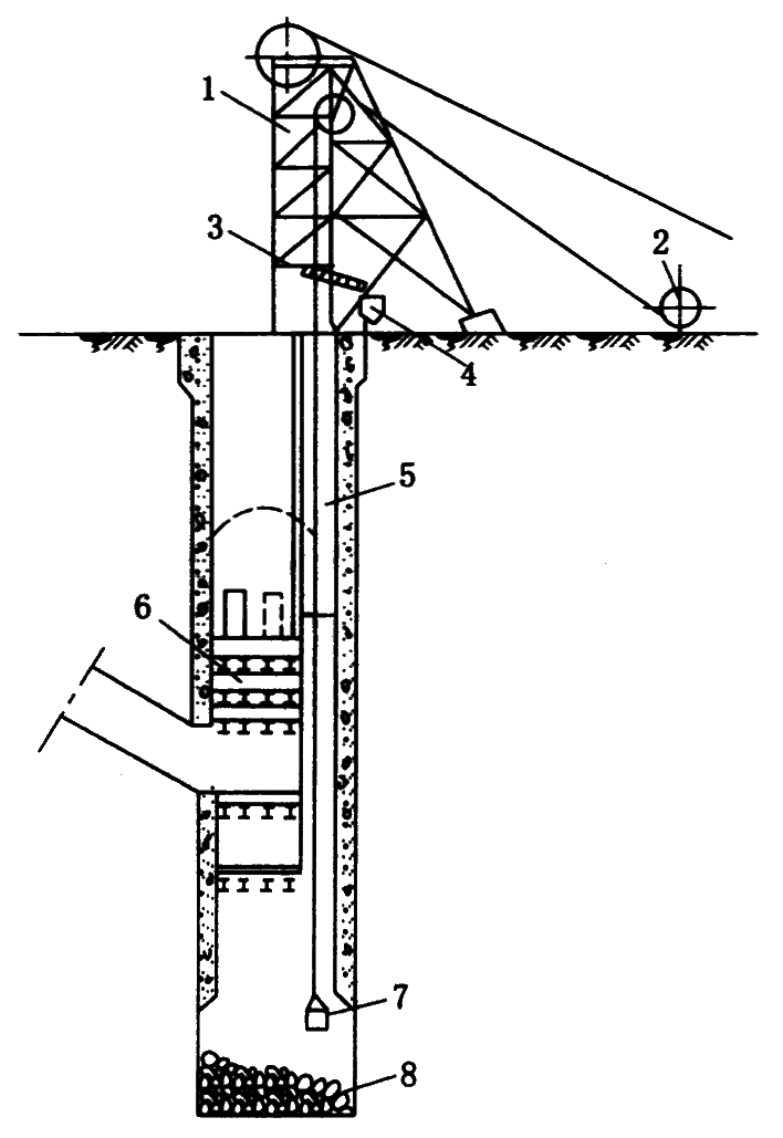 1—井架;2—套井;3—触变泥浆;4—沉井井壁;5—压风管;