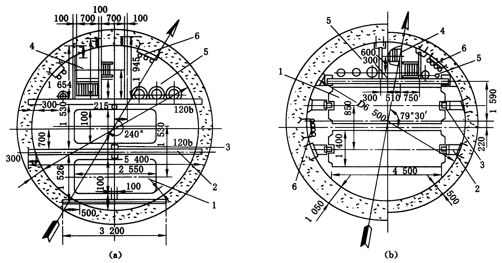 6—井下卸矸石;7—出矸绕道;8—箕斗装载硐室;9—保护设施;10—凿井绞车硐室
