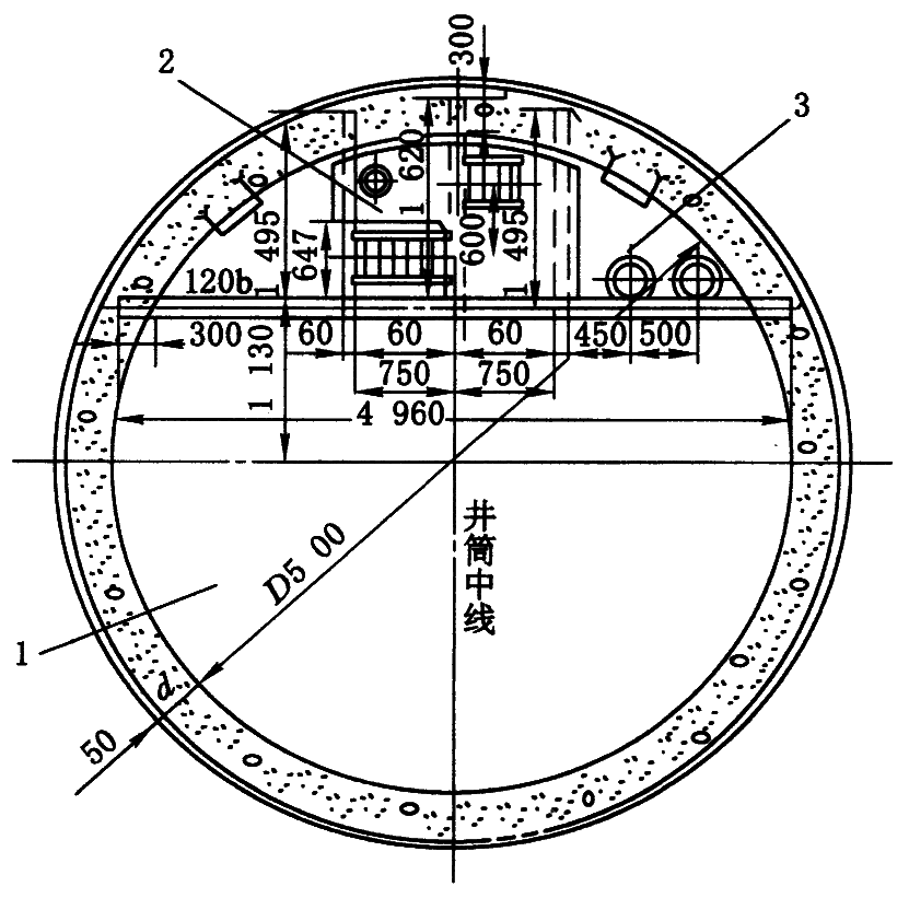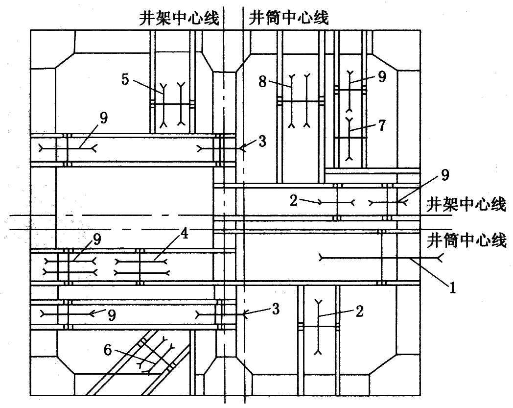 1—箕斗;2—罐梁或悬臂支座;3—罐道;4—梯子间;5—管路电缆间;6—电缆架