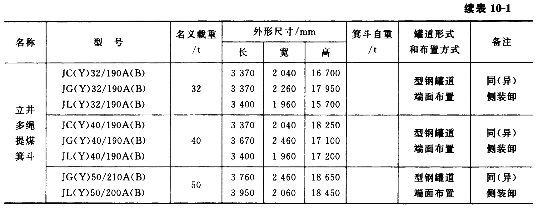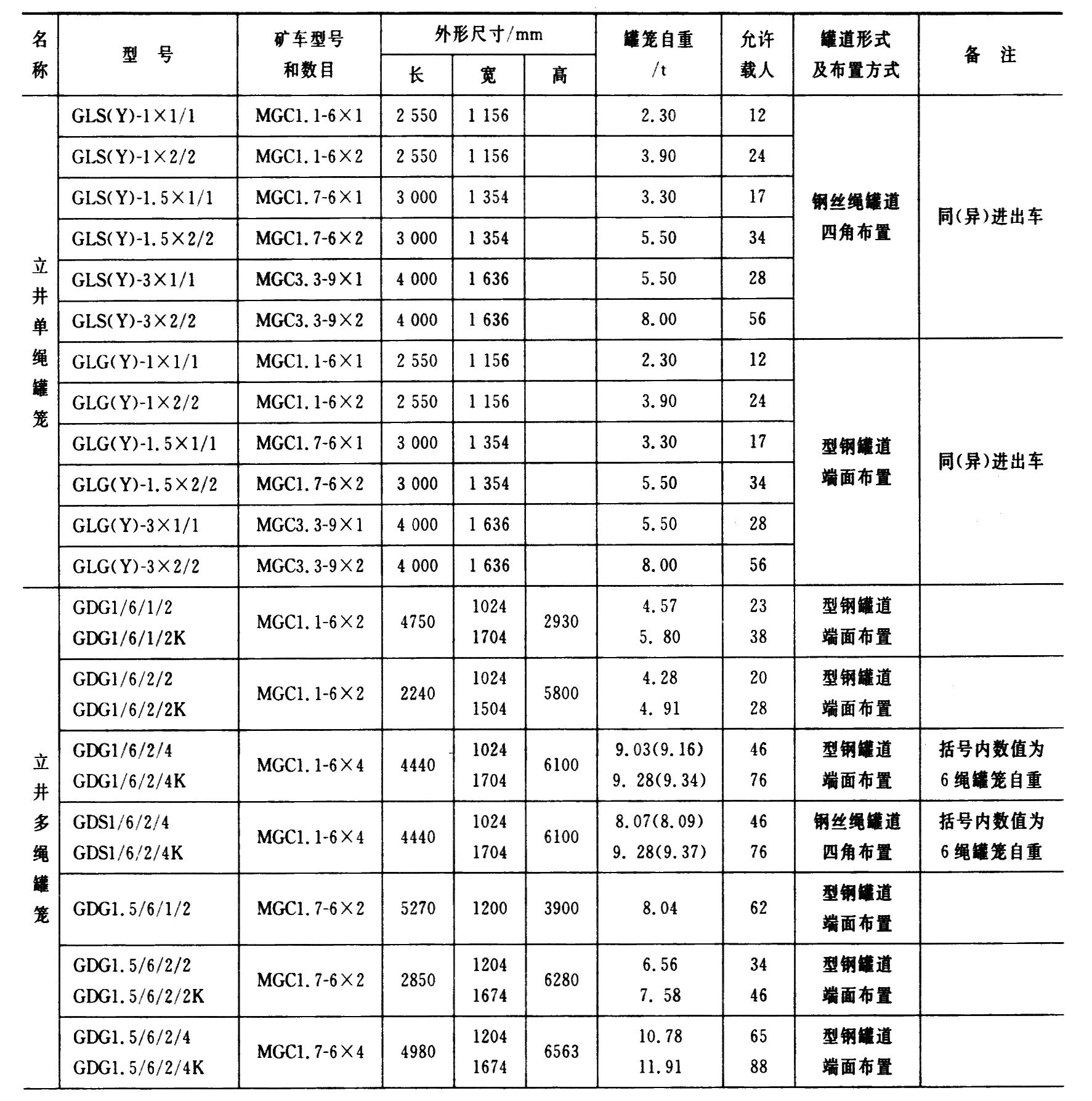 1—箕斗;2—罐笼;3—罐梁;4—托架;5—木罐道;6—钢轨罐道;