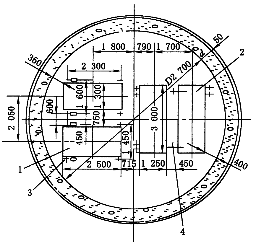 1—工字钢主梁;2—槽钢圈梁;3—槽钢副梁;4—工字钢副梁