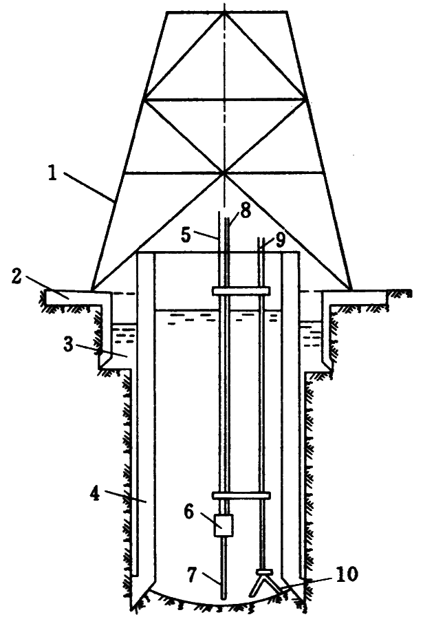1—钻塔;2—天车;3—游车;4—水龙头;5—六方钻杆;6—转盘;7—钻台;8—排浆管;9—排浆溜槽;