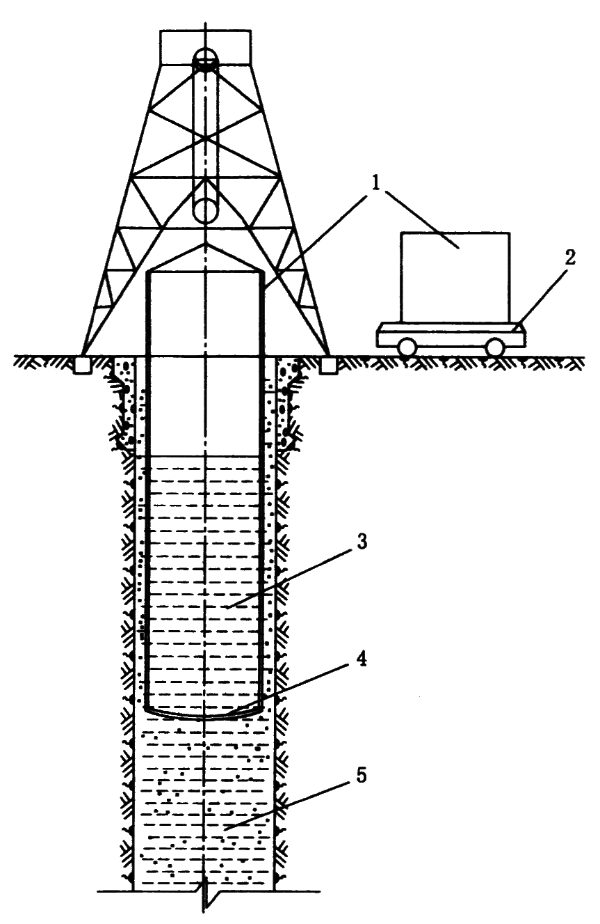1—预制井壁;2—钻台;3—配重水;4—井壁底;5—泥浆
