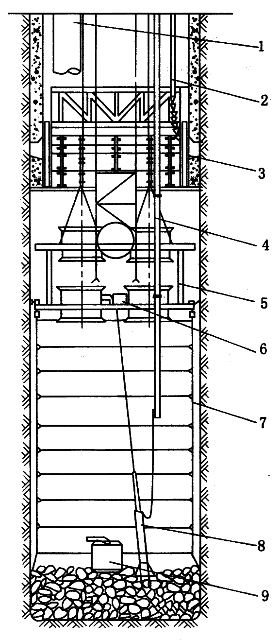 6—混凝土输送管天轮;7—安全梯天轮;8—风筒天轮;9—导向轮