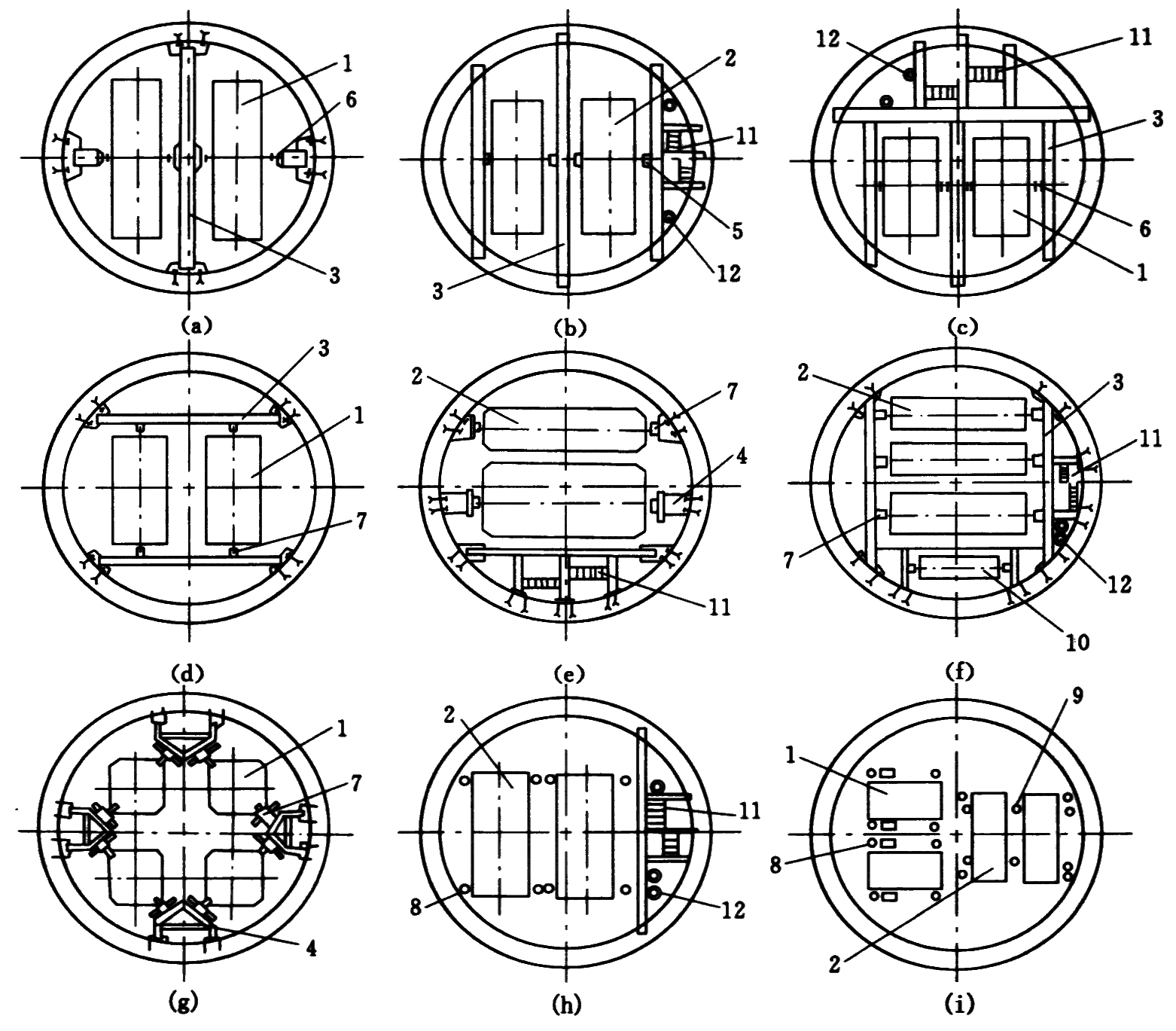 7—矩形罐道;8—钢丝绳罐道;9—防撞刚死神;10—平衡锤;11—梯子间;12—管路电缆间