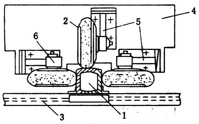 1—矩形罐道;2—滚轮;3—罐道梁;4—滚轮罐耳底座;5—滚轮支座;6—轴承