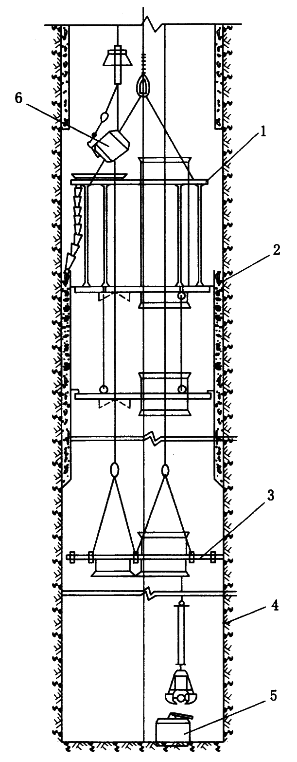 1—模板;2—抓岩机;3—吊盘;4—风筒;5—混凝土输送管;6—压风管