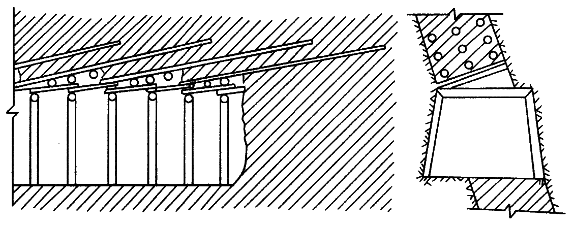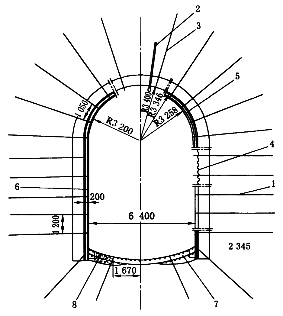 5—焊稳钢骨架及绑扎横向钢筋;6—喷射混凝土;7—开挖底拱、绑扎钢筋;8—浇灌混凝土底拱