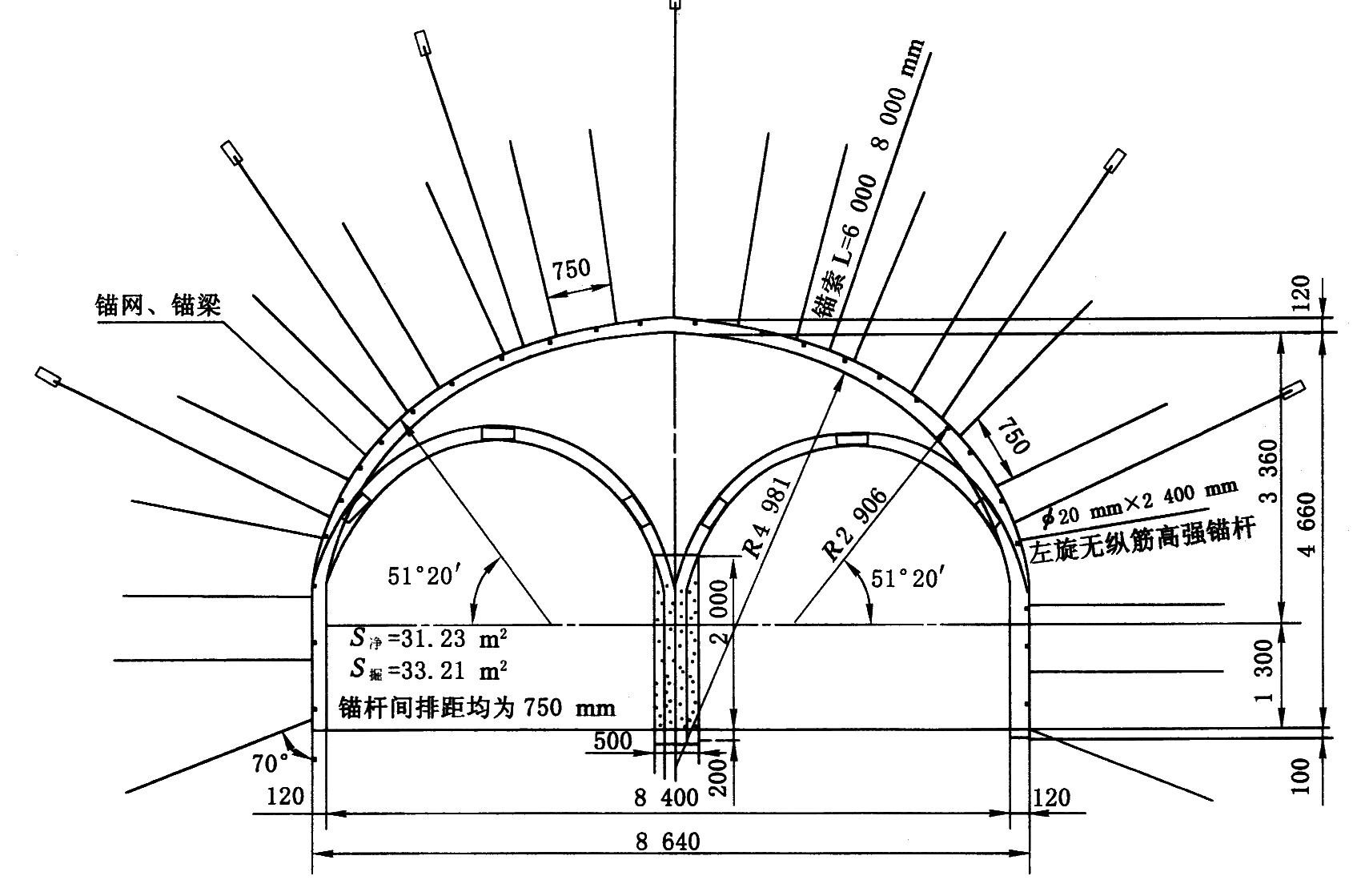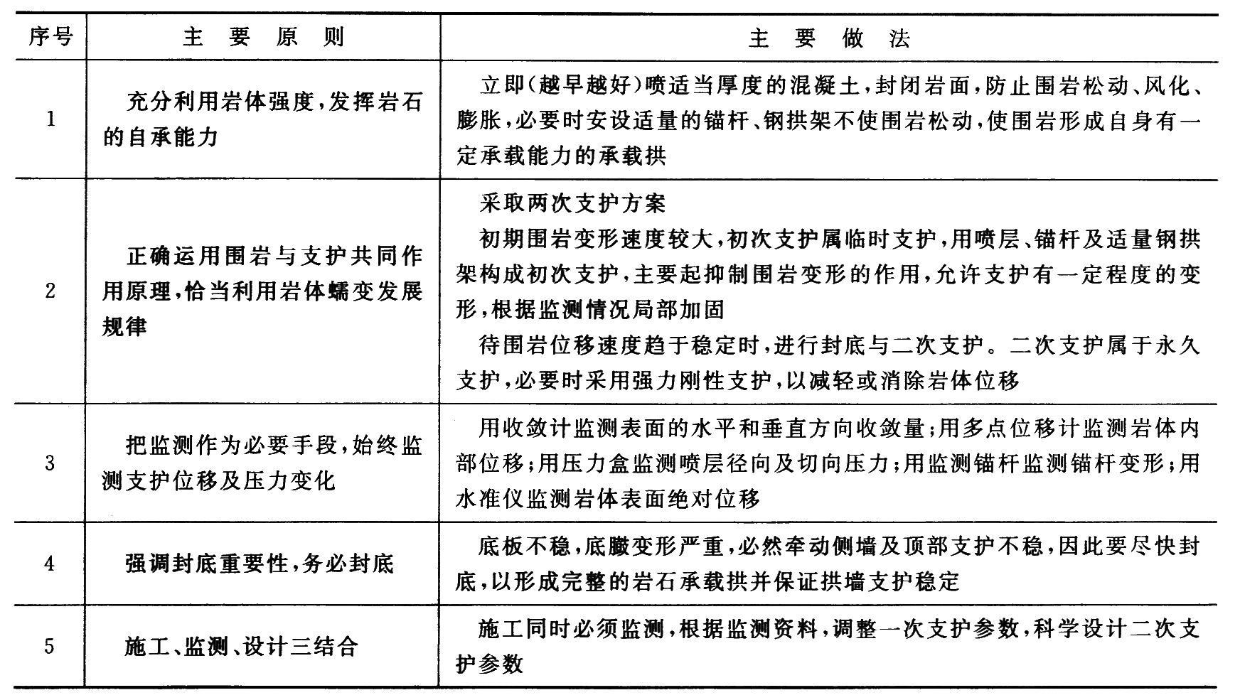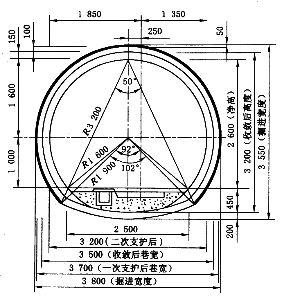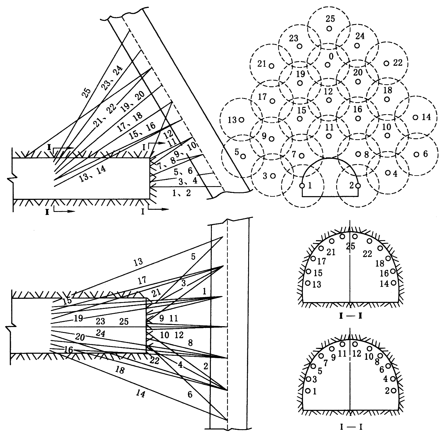 1—安装Φ25、长5.0m的锚杆(墙部);2—拱顶壁后注浆;3—安装拱部锚杆;4—开帮凿毛;