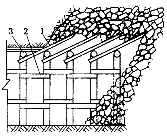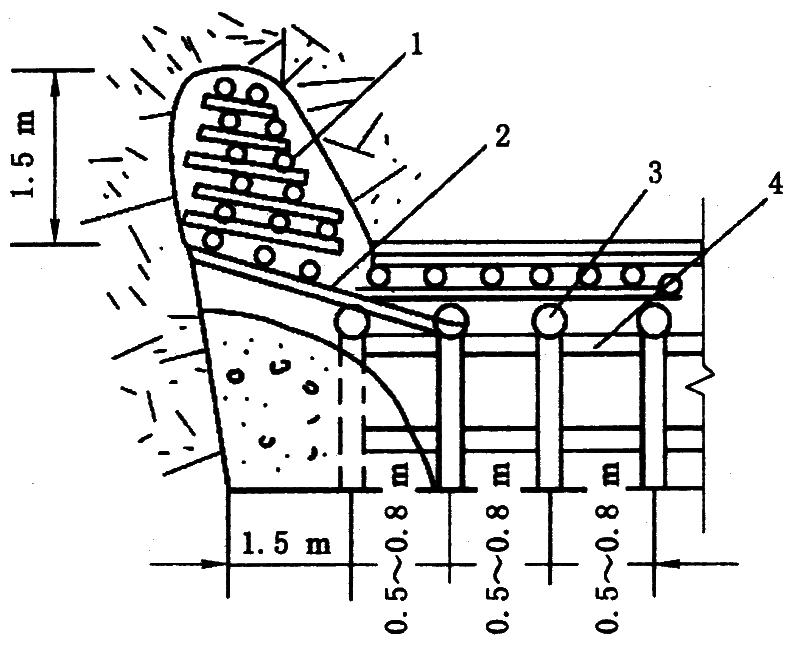 1—木垛;2—穿梁;3—支架;4—连杆