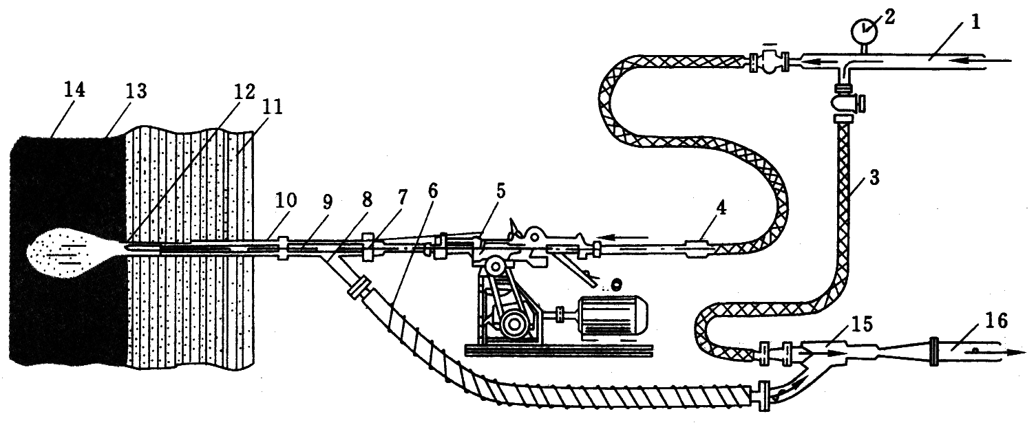 8—三通;9—钻杆;10—套管;11—安全岩柱;12—逆止钻头;13—冲孔;14—煤层;15—射流泵;16—输煤管