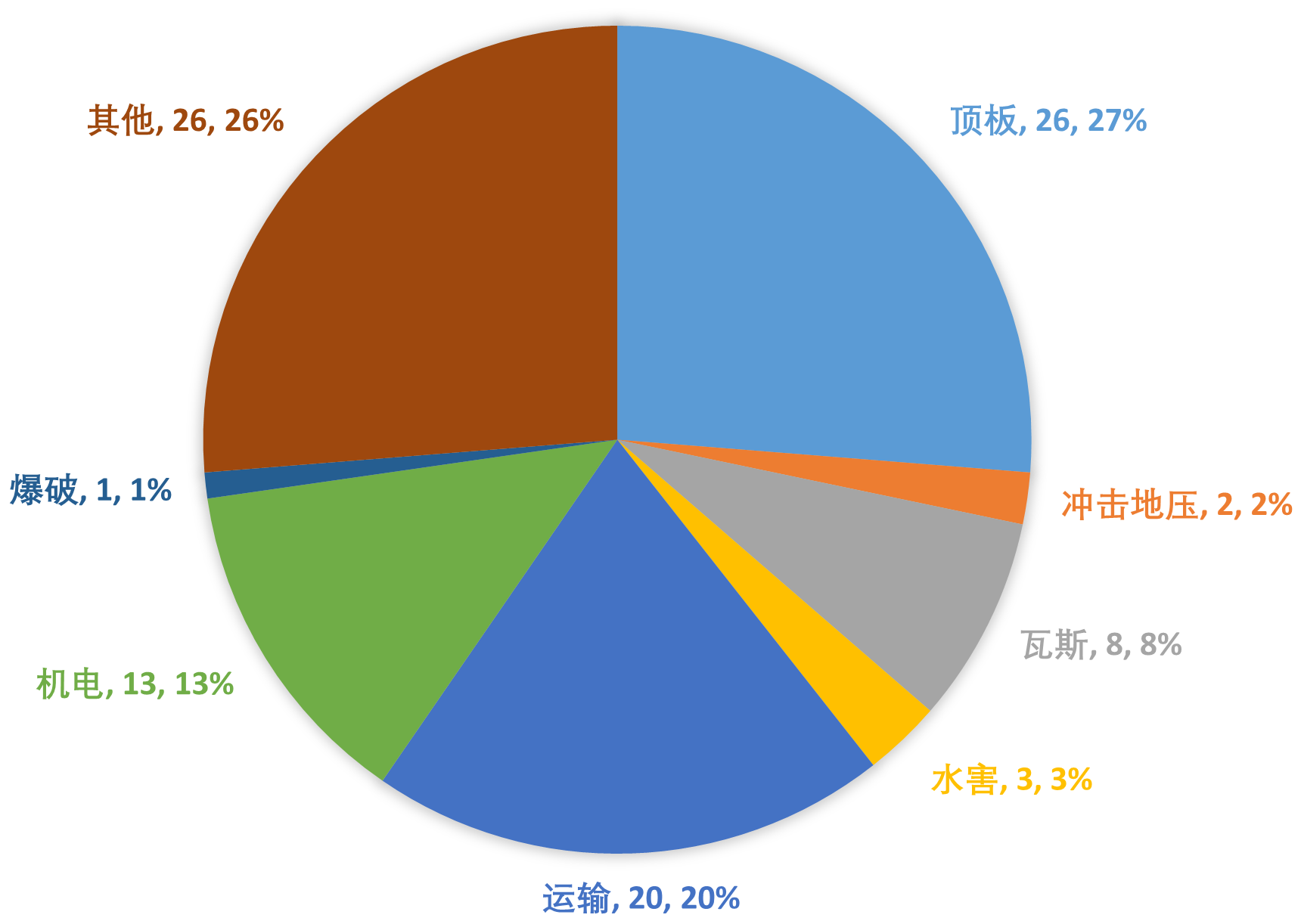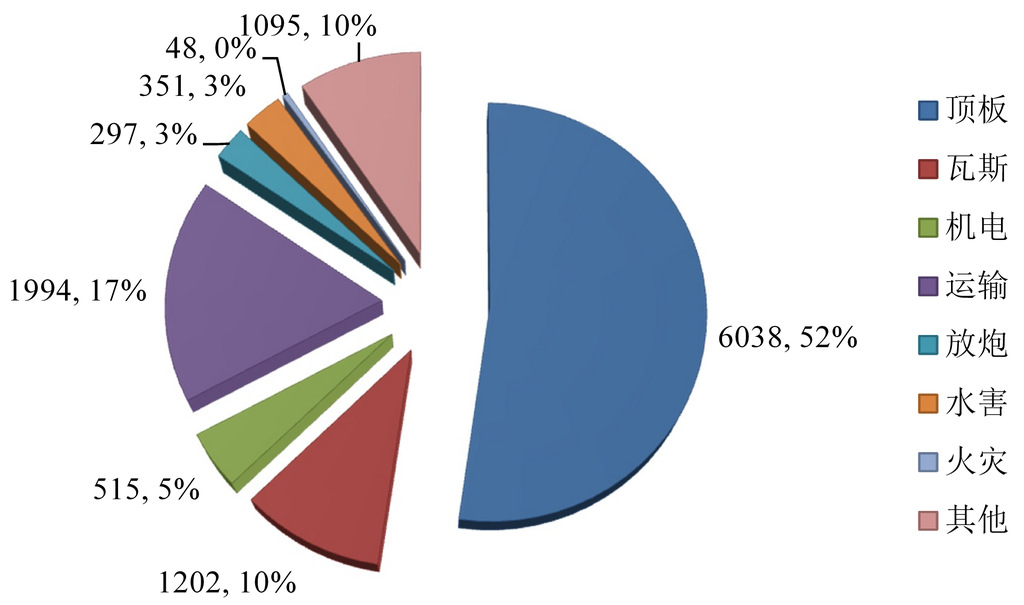 煤矿各类事故中,顶板事故(包括冒顶、片帮、支架垮倒、冲击地压等)发生次数最多,造成总伤亡最大。