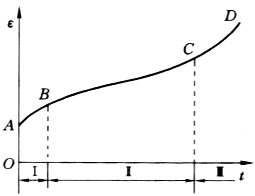 (2)AB段:第一阶段蠕变(又称初始蠕变、过渡蠕变或阻尼蠕变)。此段应变不断增加,但增长速率却随时间降低,曲线呈下凹形。