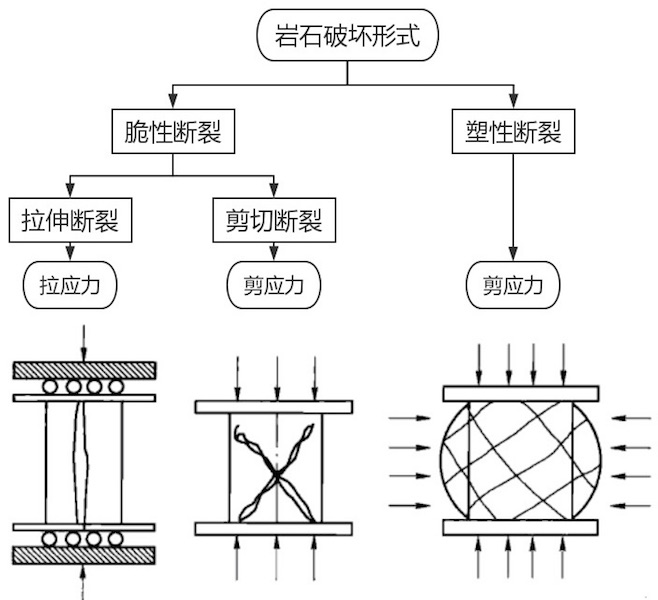 总之,岩石强度因受力状态变化而异,其强度相差甚远。岩石强度的大小关系为:三轴等压抗压 > 三轴不等压抗压 > 双向抗压 > 单轴抗压 > 抗剪 > 抗弯 > 抗拉。岩石的单轴抗拉强度一般为单轴抗压强度的1/10左右。