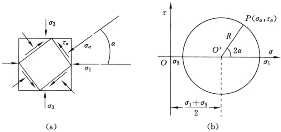 在平面应力状态下,有两个主应力\(\left( {{\sigma _1},{\sigma _3}} \right)\)作用在某一点上,则最大主应力\({\sigma _1}\)与外法线成\({\alpha}\)角的斜切面上法向应力\({\sigma _\alpha}\)和剪应力\({\tau_\alpha}\)的表达式为: