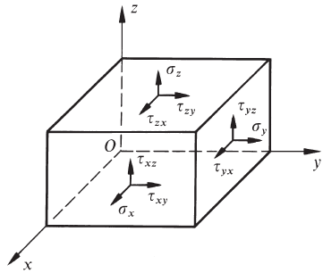 \[\sigma_{ij} = \begin{bmatrix} \sigma_{x} & \tau _{xy} & \tau_{xz}\\ \tau_{yx} & \sigma_{y} & \tau_{yz}\\ \tau_{zx} & \tau_{zy} & \sigma_{z} \end{bmatrix}\]