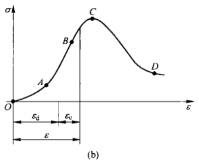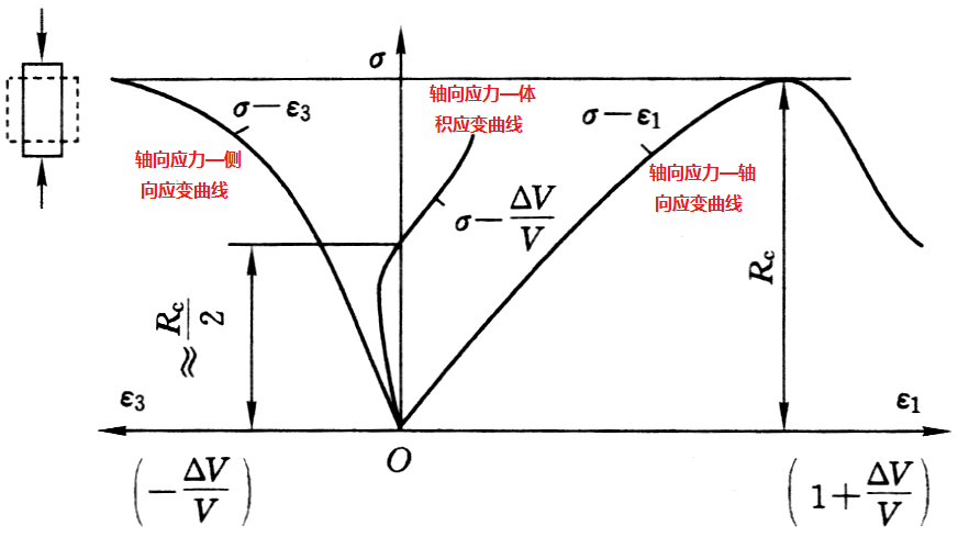 岩石在塑性阶段的体积膨胀称为扩容现象,该现象主要是由于裂隙产生、贯穿、张开等造成的,相对于原体积来说,体积由减小到增大大约在\(\sigma = {\sigma _c}/2\)附近。